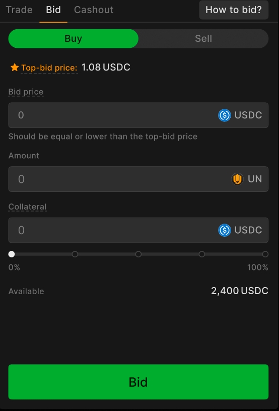 एक आदेश खोलने के लिए: आपको बस USDC में मूल्य, मात्रा, और पूंजी संपार्श्विक संपत्ति का चयन करना है, और टोकन खरीदने के लिए Buy बटन पर क्लिक करना है।