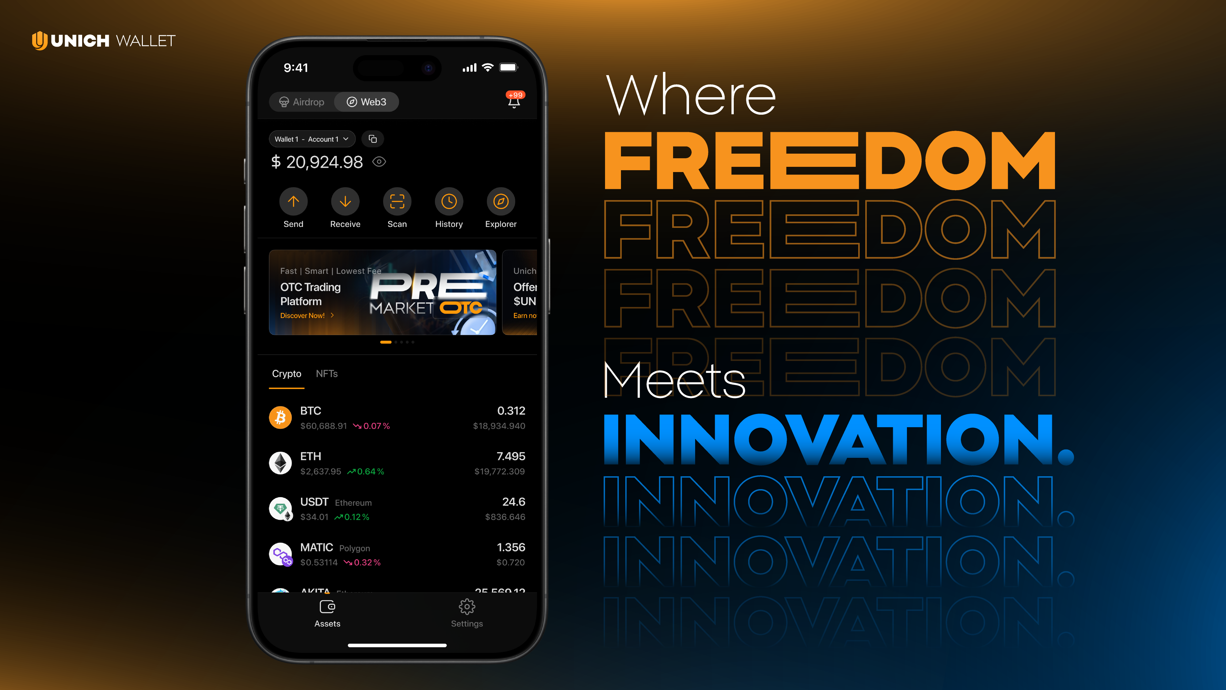 Our main goal is to use blockchain technology to help people gain more freedom. We want everyone to have full control over their digital assets. That’s why our slogan is "Catch Your Freedom." Unich OTC Wallet gives you the tools you need to manage your money on your own, safely, and without relying on others.