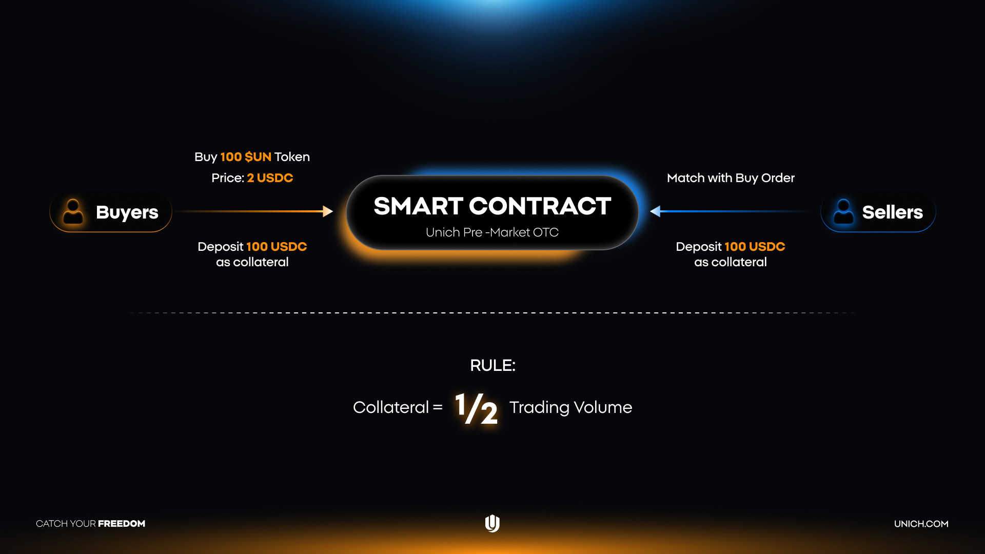 Jumlah yang perlu dijaminkan oleh Penjual untuk mencocokkan pesanan adalah: $200 × ½ = 100 USDC.