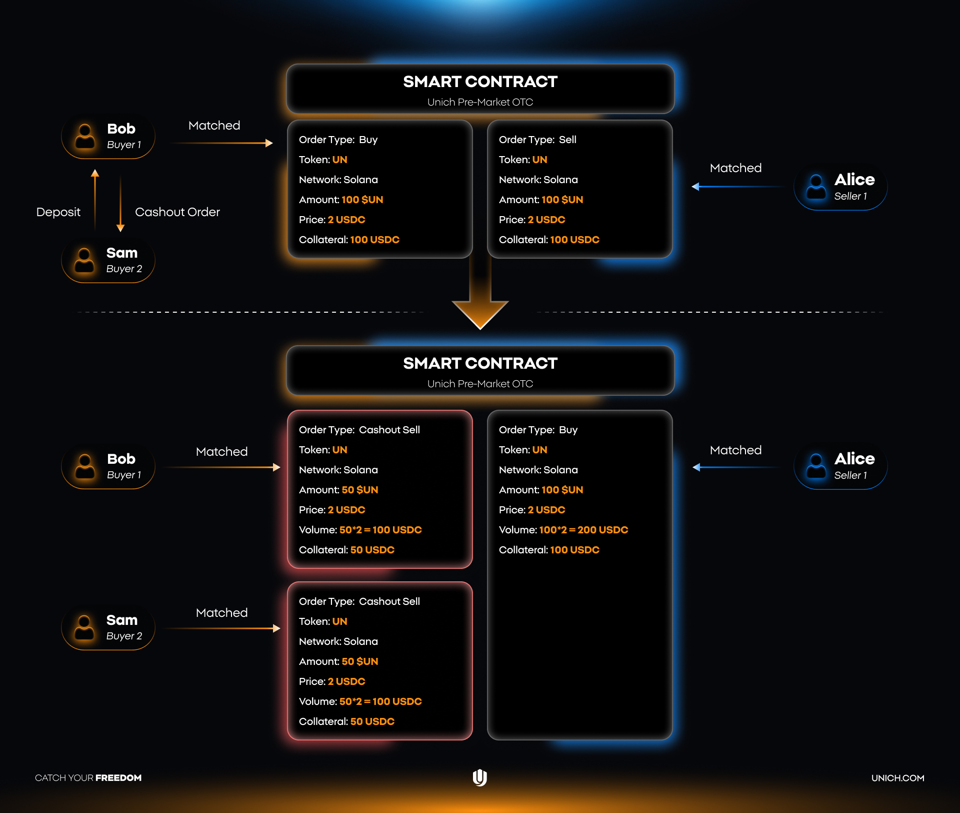 Bob과 Alice는 200 USDC 거래량의 $UN 토큰 거래를 일치시켰습니다.