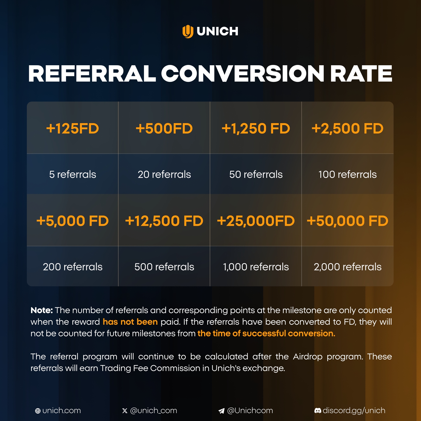 Unich 에어드롭 캠페인의 일환으로 지금 바로 추천 프로그램에 참여하세요! 여기서 Unich 커뮤니티를 성장시키면서 FD 포인트와 보상을 적립할 수 있습니다.