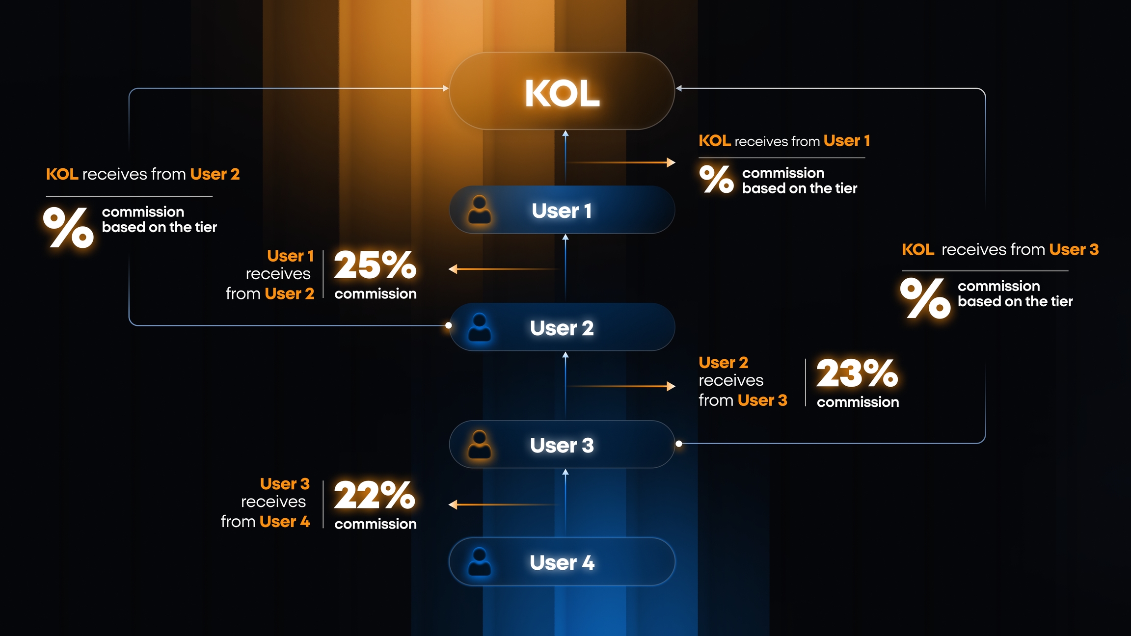Ang mga KOL ay makakatanggap ng porsyento ng komisyon mula sa User 1, User 2, at User 3 batay sa kanilang KOL tier.