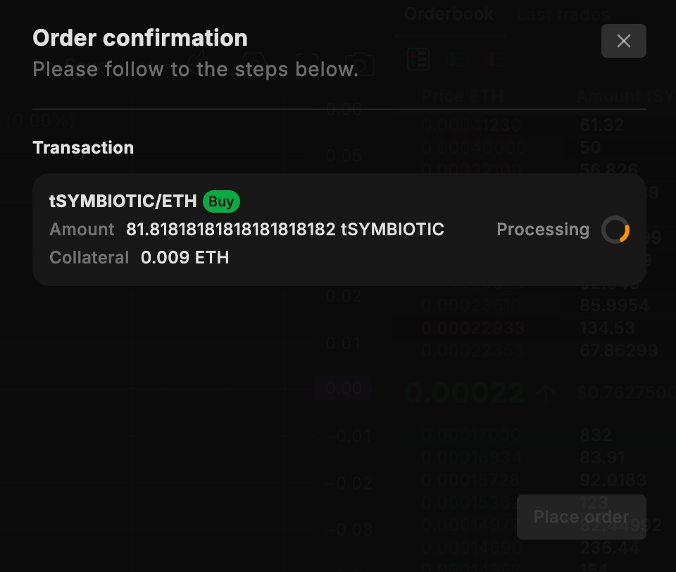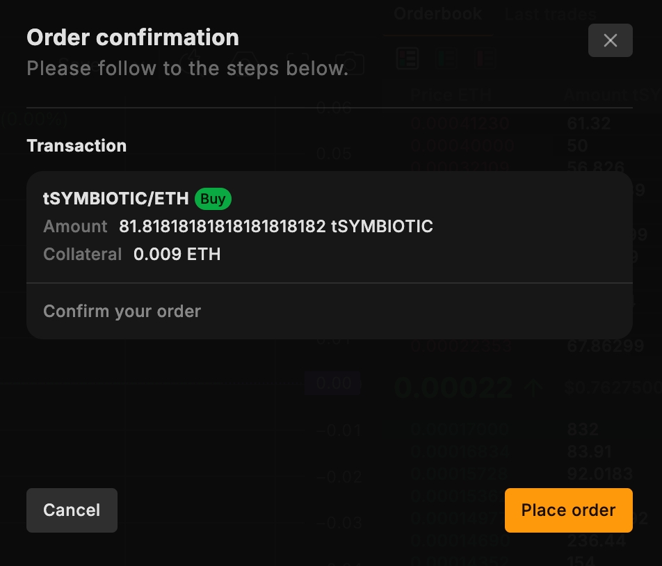 Siparişin zincir üzerinde oluşturulmasını onaylamak ve aynı anda işlem için teminat olarak USDC göndermek için "Sipariş Ver"e tıklayarak devam edin.
