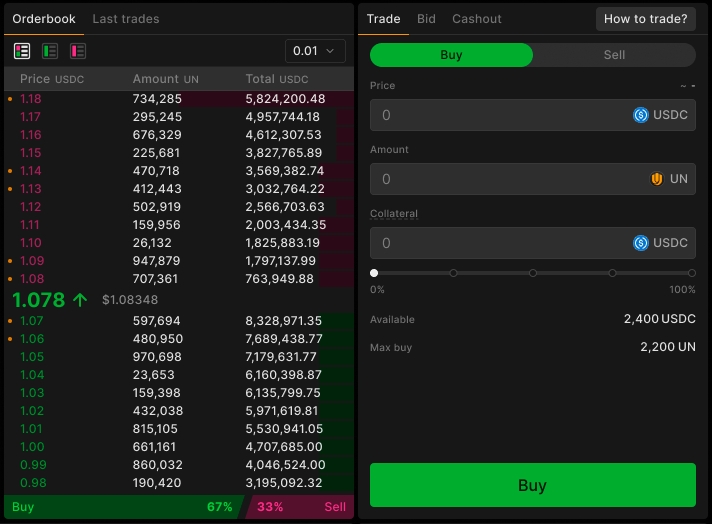 Sadece fiyatı, miktarı ve teminat varlığını USDC olarak seçmeniz yeterlidir, ardından token satın almak için Satın Al butonuna tıklayın.